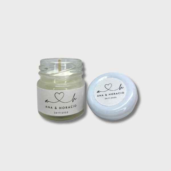 Vela decorativa de 20 g en tarro de cristal con tapa metálica.